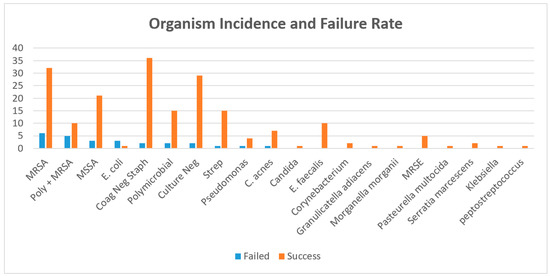 Organism Profile (%Failure). Associated MRSA infection yielded 20.75% failure rate. Abbreviations: Coag: coagulation, Neg: negative, MRSA: methicillin-resistant staphylococcus aureus, MSSA: methicillin-sensitive staphylococcus aureus, Strep: streptococcus species, Poly: polymicrobial, E. Faecalis: enterococcus faecalis, C. acnes: cutibacterium acnes, MRSE: methicillin-resistant staphylococcus epidermidis, and E. coli: Escherichia coli.
