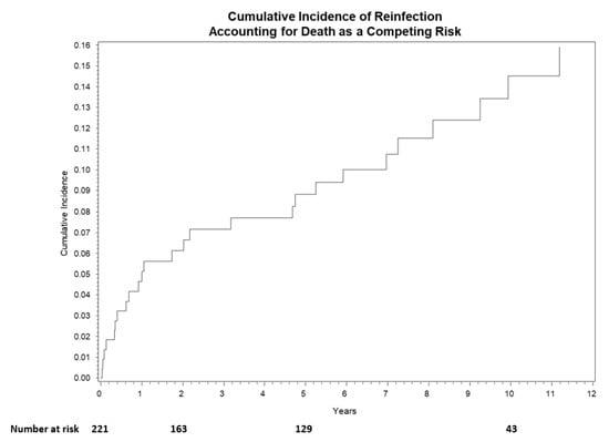 The median follow-up of surviving patients was 5.80 (range, 0.40–23.40) years. Overall survival at 1-year, 3-year, and 5-year was 93% (95% CI: 89–96%), 88% (95% CI: 82–91%), and 80% (95% CI: 74–86%), respectively (Figure 3). Cumulative incidence of reinfection at 1-year, 3-year, and 5-year was 5% (95% CI: 2–8%), 7% (95% CI: 4–11%), and 9% (95% CI: 5–13%), respectively (Figure 4).