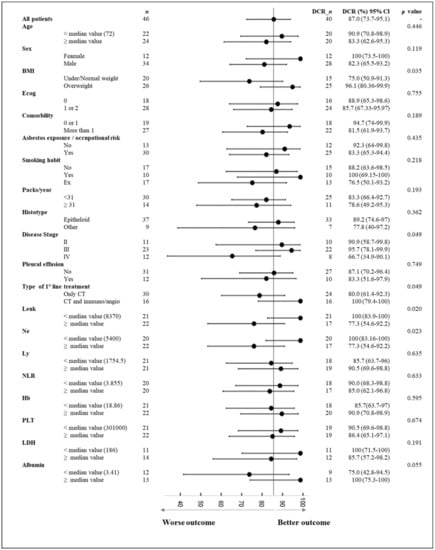 Furthermore, the therapeutic response was significantly correlated with the disease stage (p-value 0.049). Specifically, the patients with a tumor stage of III showed a DCR of 95.7% (95% IC, 78.1–99.9%), whereas for disease stage IV, the DCR decreased to 66.7% (95% IC, 34.9–9.1%). Moreover, the therapeutic response was significantly correlated with blood values of leucocytes, neutrophils, and albumin serum levels (p values < 0.10). In particular, the initial response to chemotherapy was more favorable for patient with lower levels of leukocytes and neutrophils, and higher albumin serum levels; these patients reached a DCR of 100% (95% IC, 83.90–100%), 100% (95% IC, 83.16–100%), and 100% (95% IC, 75.30–100%), respectively. A better initial response was also observed in overweight patients (p-value 0.035), who achieved a DCR of 96.10% (95% IC, 80.36–99.9%).