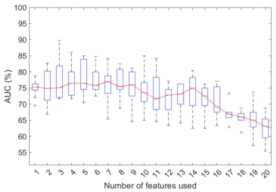 The classification performances for an increasing number of features identified by the sequential feature selection algorithm are shown in Figure 2. The model performances seemed particularly variable, perhaps due to the small sample size and the strong imbalance of the training classes. However, the best performances were observed when considering seven features, with a median AUC value of 77.0% (interquartile range, IR of 73.3–78.8%); beyond this value, a reduction in classification performance was observed. Specifically, with seven features, the classification model showed a median accuracy, sensitivity, and specificity of 75% (IR 63.04–84.8%), 74.8% (IR 57.5–87.5%), and 83.3% (IR 667.7–100%), respectively.