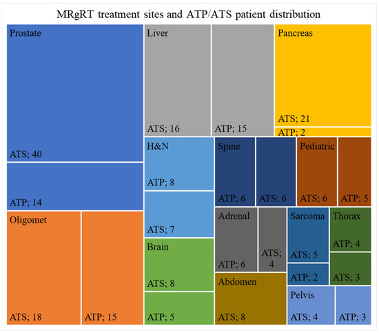 From 22 May 2019 to 1 December 2021, 234 patients received treatment using MRgRT, and of these patients 121 were treated using a stereotactic body radiotherapy (SBRT) technique. For these patients, 3242 fractions were delivered with 594 (18.3%) following the adapt-to-shape (ATS) workflow and 2648 (81.6%) with the adapt-to-position (ATP) workflow. The most commonly treated site was prostate (23%) with oligomets (14%), liver (13%), and pancreas (10%) being the next most common sites of treatment. The total distribution of treatment sites and patients treated with ATP or with at least one ATS fraction can be found in Figure 1.