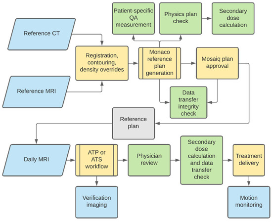 Workflow diagram showing major processes in treatment-plan generation and delivery. Imaging steps noted in blue, quality assurance (QA) steps noted in green, and planning or delivery steps noted in yellow.