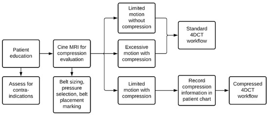 As seen in Figure 1, liver cancer treatments make up a significant fraction of the patient population treated using MRgRT at our institution. To account for respiratory motion during planning, an internal target volume (ITV)-planning strategy with the possibility of abdominal compression is used pending the release of respiratory-based gating. An overview of the simulation decision workflow is shown in Figure 4. Briefly, a patient is educated prior to simulation and screened for contraindications of abdominal compression such as hernias or ostomy bags. The patient is then taken to the MRI simulator and a cine MRI is used to determine the effectiveness of the abdominal compression on an individual-patient basis. A sagittal and coronal cine MRI (TE: 3.8 ms, TR: 1.92 ms, flip angle: 40 deg) are acquired over 60 s to capture multiple breathing cycles. First, a cine MRI with no abdominal compression is acquired where the motion of the diaphragm in the superior/inferior and anterior/posterior directions are measured as a surrogate for the liver tumor [17]. If the magnitude of this motion is clinically unacceptable (>15 mm Euclidian), abdominal compression is applied, and a cine MRI is again acquired to reassess the motion magnitude of the diaphragm. If the Euclidian motion is still >15 mm with compression, a physician and physicist consultation is required to determine how to proceed. If it is determined that the motion is too large, the patient may be transferred to a machine with gating capabilities for treatment. If an acceptable amount of motion (<15 mm) is achieved with compression, the compression parameters are recorded, and the MRI-simulation images are acquired with the patient under compression. The tumor motion is determined based on the post-gadolinium-injection cine-MRI images, and this motion is compared to the diaphragm surrogate motion and recorded. The patient then is transferred for computed tomography (CT) simulation. At CT, the patient is compressed as they were during MRI simulation from their recorded chart notes, and an exhale breath-hold scan is acquired. Following this, a four-dimensional computed tomography (4DCT) or inhalation breath-hold scan will also be acquired (if a high-quality 4DCT is unable to be acquired due to patient compliance). It should be noted that this imaging workflow is the same for noncompressed patients with minimal motion (<10 mm), just without the addition of the compression device at MRI or CT.