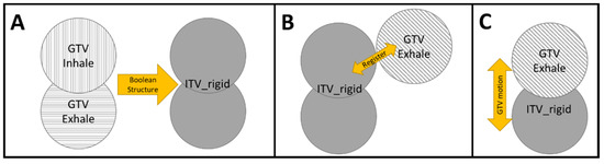 ITV planning and treatment strategy for compression patients. (A) An ITV is created from inhale and exhale simulation scans and set as a rigid structure. (B) The rigid structure can be registered to the GTV from the navigator-triggered image along the superior edge. (C) GTV motion can be verified using motion monitoring.