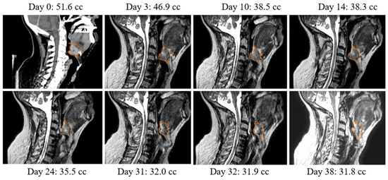 For the 15 patients treated for head and neck cancer, 27 offline adaptions have been performed and 8 online adaptions have been performed. One patient was adapted a total of 8 times offline to account for both tumor regression and variations of patient anatomy, shown in Figure 7. The tumor volume decreased by approximately 38% of the initial volume over the course of treatment. Four of the offline adaptions were performed for reasons other than tumor regression, such as patient weight loss or variations in patient positioning.