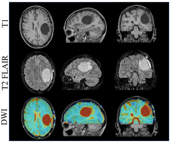 T1 (Top), T2 FLAIR (Center), and DWI (Bottom)-imaging 1.5T MR-linac.