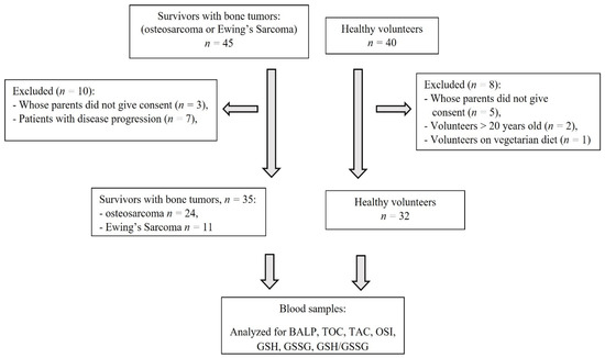 Gajewska, J.; Chełchowska, M.; Rychłowska-Pruszyńska, M.; Klepacka, T.; Ambroszkiewicz, J. Oxidative and Antioxidative Status Expressed as OSI Index and GSH/GSSG Ratio in Children with Bone Tumors after Anticancer Therapy Completion. J. Clin. Med. 2022, 11, 1663. https://doi.org/10.3390/jcm11061663