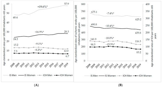 Time trends in age-standardized † rates of patients hospitalized for ischemic stroke (IS) and intracerebral hemorrhage (ICH) between 2008 and 2019 in France according to sex and age group. (A) Among inhabitants under 65 years. (B) Among inhabitants over 65 years. Gray: men; black: women. * p-value for trend < 0.05. † Rates standardized on the age structure of the 2010 European population census.