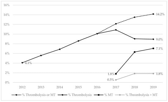 Time trends in the rates of thrombolysis and mechanical thrombectomy (MT) in patients hospitalized for ischemic strokes from 2012 to 2019. Note: Thrombolysis data have only been available since 2012; MT has only been referenced as a medical procedure since August 2017.