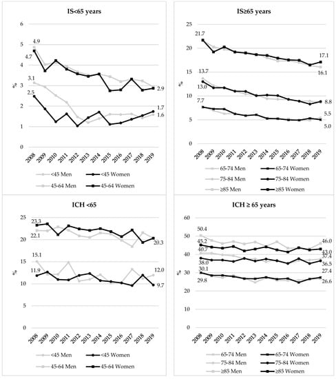 Our study confirmed the increasing trend in the rates of patients hospitalized for IS among people aged under 65 years, particularly those aged 45–64 years and men aged 18–34 and 35–44 years. This trend is accompanied by an increase in the absolute number of men and women hospitalized for IS in these age groups. For the first time, we observed a decrease in the rates of patients hospitalized for ICH since 2013–2014 in all age groups over 50 years for both sexes. Women had a lower chance of being admitted to an acute stroke care unit, as did patients with many comorbidities and those admitted to a geriatric unit.