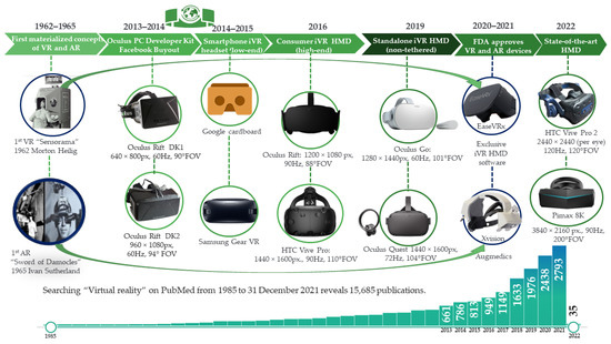 The concepts behind virtual reality (VR) and augmented reality (AR) have been intuited since the very dawn of processing units. The technical evolution and growing accessibility of consumer VR equipment are directly proportional to medical research publication trends (Figure 1). Even throughout the SARS-CoV-2 pandemic, technological development continued respecting the doubling number of microprocessors transistors, sensor development, and pixilation density every two years, as stated in the half-century-old Moore’s Law [15], thus facilitating the iVR concept materialisation. The specifications of iVR headsets displays can be simplified as resolution or pixel density of their lenses (px), the field of view (FOV), and refresh rate per second (Hz) [16]. Millstones in the evolution of iVR equipment were made both on AR and VR: