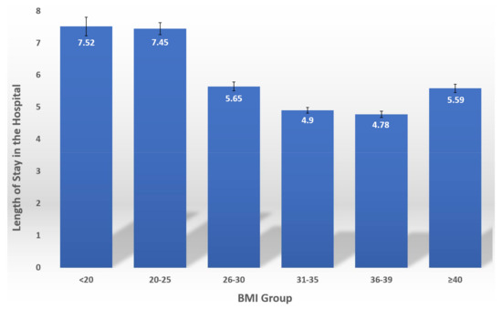 The average length of stay in the hospital was 5.64 ± 0.07 days. Figure 1 shows the relationship between BMI and the length of hospitalization in the study population. The correlation between BMI and LOS was a reverse J shape in nature with shorter hospital stay in overweight and obese patients, p < 0.001.