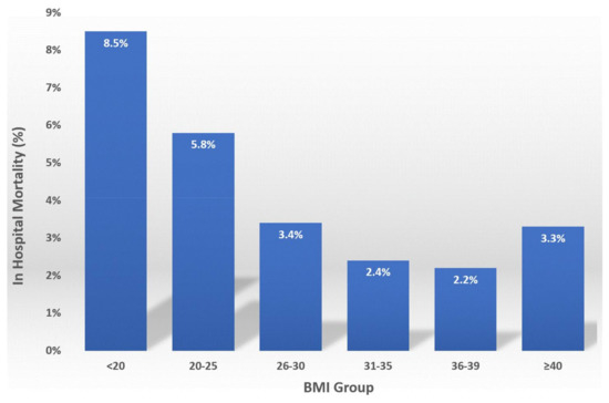 The data presented here reveals a reverse J-shaped relationship between the body mass index and in-hospital mortality in stroke patients, while the mild and moderately obese patient subgroups (BMI 31–39) exhibited the lowest in-hospital mortality in this study. Prior studies have suggested that the “obesity paradox”, described in various cardiovascular conditions including in myocardial infarction, heart failure and sudden death, may apply to patients admitted with a stroke, resulting in lower mortality in obese patients [15,16,17,18,19]. Importantly, many of the prior investigations clustered all patients with BMI > 30 into one study group, showing improved outcomes. We have further subdivided the obese patients in three groups, as described in the methods section. We documented decreased mortality only in the first two of these subgroups (30 < BMI ≤ 35 and 35 < BMI < 40), while in extremely obese patients (BMI ≥ 40), the documented mortality was higher than in patients with BMI between 31–39 kg/m2 (Figure 2).