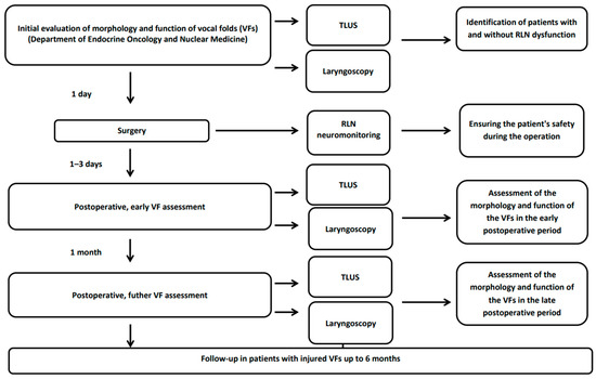 Figure 1. Scheme of the study. RLN—recurrent laryngeal nerve; TLUS—translaryngeal ultrasound; VF—vocal fold.