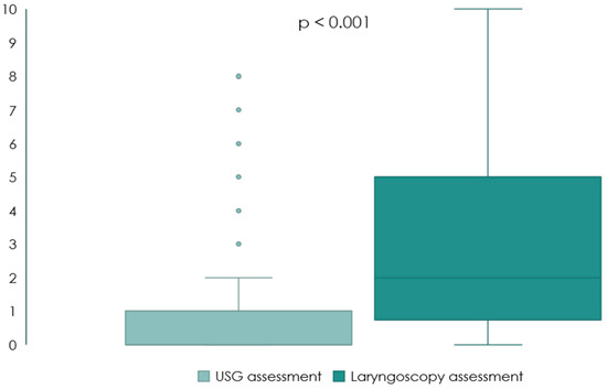 Most patients (n = 150, 65.2%) stated that the laryngoscopic examination was much more uncomfortable compared to TLUS, with significantly higher points on the VAS, p < 0.001 (Table 2, Figure 2).