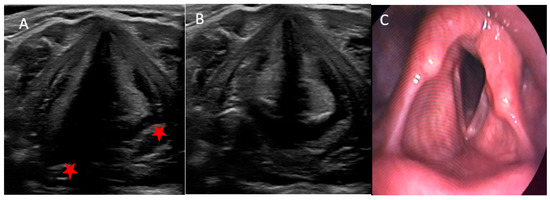 Figure 3. An example of left-sided paralysis, visible asymmetry of VFs and arytenoids (red star) and lack of movement of the left-hand VFs in adduction and abduction in TLUS (A,B) and during the videolaryngoscopy (C).