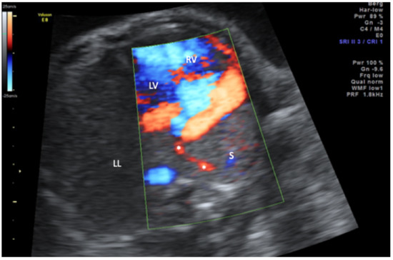 Transverse thoracic view in color-mode demonstrating the scimitar vein (asterisk) draining the sequestration (S) into the inferior vena cava (not displayed). LL, left lung; LV, left ventricle; RV, right ventricle.