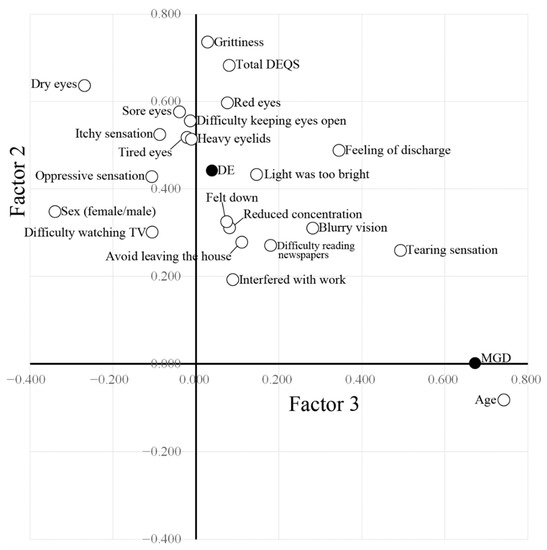 Table 3. Relations among ocular symptoms, dry eye (DE), and meibomian gland dysfunction (MGD) according to Factors 1, 2, and 3, respectively.