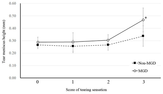Figure 2. Relation between tear meniscus height (TMH) and frequency of tearing sensation in subjects with or without MGD. Data for TMH are means ± s.d. p-values were determined with a linear mixed-effects model (* p < 0.05).