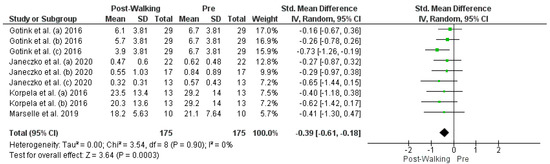 | Gotink et al. [14] | Pre-walk and postwalk (time 1) | Depression | DASS-21 | 6.1 | 3.81 | 29 | - | - | - | 6.7 | 3.81 | 29 |