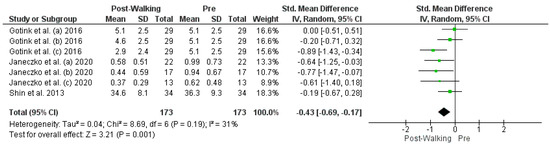 | Shin et al. [12] | Pre-walk and post-walk | Anxiety | STAI | 34.6 | 8.1 | 34 | - | - | - | 36.3 | 9.3 | 34 |
