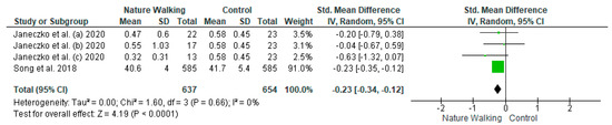 | Marselle et al. [10] | Group walk in nature | Depression | A 10-item major depressive inventory | −0.08 | 0.02 | 1506 | - | - | - | 0.48 | 0.02 | 1506 |