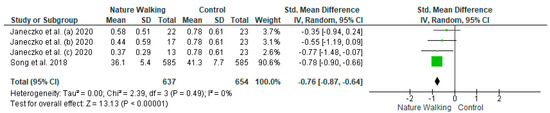 | Janeczko et al. [13] | 2020 | Poland | A total of 75 university students walking in deciduous forests, coniferous forests, green suburbs, and apartment suburbs | 30 min 2 km walk | Profile of Mood States (POMS) | Differences between the groups showed the reduction of depression following the intervention | ||