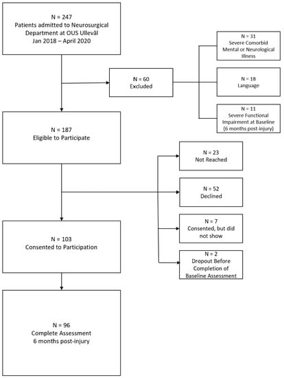 Injury characteristics and clinical data from the acute hospital stay were retrieved from the Oslo TBI Registry—Neurosurgery, a quality database at OUH []. The remaining variables were measured approximately 6 months post-injury. Inclusion criteria were patients between 18–65 years of age, admitted with TBI (ICD-10 diagnoses S06.1–S06.9), herein defined as patients presenting with intracranial injury (as confirmed by computed tomography (CT) or magnetic resonance imaging (MRI)) during the acute phase, and who have survived until six months post-injury. Exclusion criteria were pre- and comorbid diagnoses of severe mental illness or neurological disorders, ongoing substance or alcohol abuse, non-fluency in Norwegian or English, and severe functional impairment hindering completion of the study protocol (i.e., disorders of consciousness, persistent severe anosognosia and severe motor deficits). Patients were identified prospectively after admission to the Neurosurgical department at OUH. Patients were recruited through clinical follow-up consultations at Sunnaas Rehabilitation Hospital and the Department of Physical Medicine and Rehabilitation at OUH. Patients not followed up at these institutions received an invitation to participate by mail.