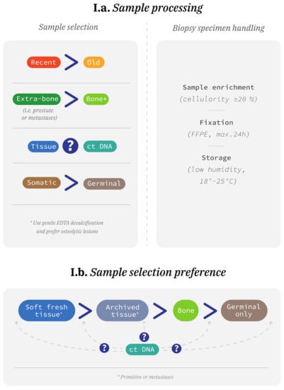 The origin of collected samples is also important, since visceral or soft tissue should be preferred over bone metastases. Bone samples require decalcification, which may lead to DNA degradation, but the use of EDTA may limit this issue [47]. Unfortunately, bone lesions are the first site of metastases (80–90%), mostly osteoblastic and for roughly 50% of patients with mCRPCs, the only site available for biopsy [48].