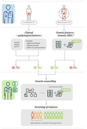 Genetic counseling is recommended for patients with non-metastatic PCs and a family history of PCs (depending on the recommendations, family history criteria differ) [56,57,58]. It should be considered for aggressive diseases (≥T3a, intraductal, ≥Gleason 8, positive lymph nodes), Ashkenazi Jewish Ancestry, ≥2 relatives with cancer in the spectrum of hereditary breast–ovarian cancer or Lynch syndrome. Finally, men without PCs should be addressed to geneticists in case of a family history of PCs and consultations should be considered if they have 2 or more relatives with hereditary breast–ovarian cancer or cancer of Lynch spectrum.