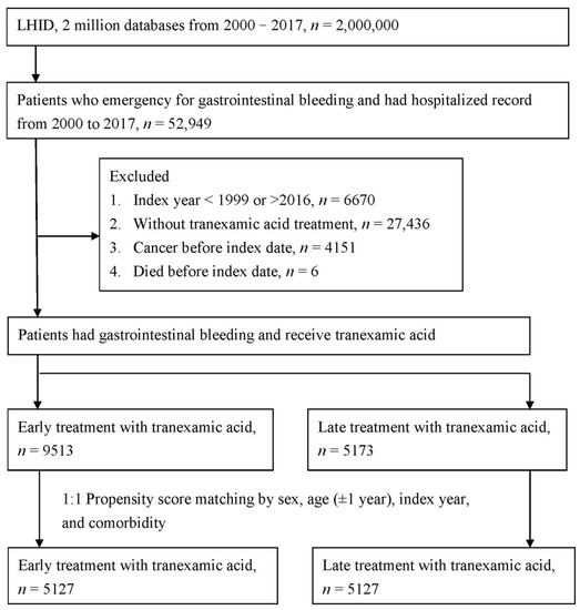 A possible confounding factor is the timing of TXA administration, which has rarely been considered in studies and could affect study outcomes. Hence, this nationwide cohort study aimed to identify whether early or late use of TXA reduced the mortality of patients with gastrointestinal bleeding in Taiwan. We hypothesized that patients with gastrointestinal bleeding receiving TXA early would have lower risk of mortality.