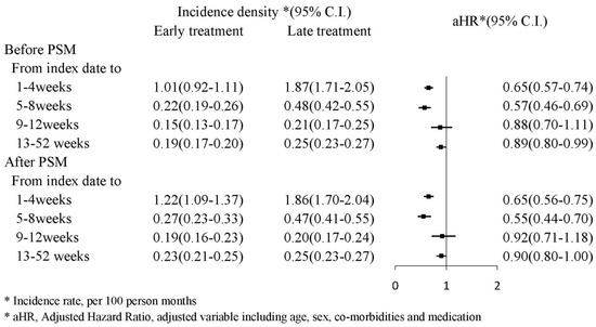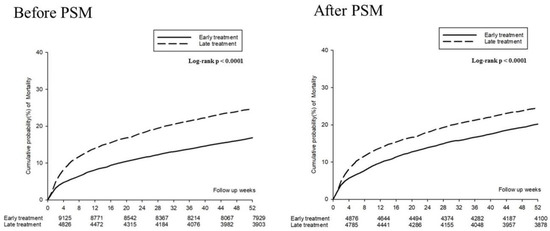 Figure 2 presents the mortality incidence density (per 100 person month), which were 1.22 (95% CI: 1.09–1.37) and 1.86 (95% CI: 1.70–2.04) in the PSM early and late treatment groups, respectively; the adjusted HR for early treatment was 0.65 (95% CI: 0.56–0.75) during the first and fourth weeks. During the 13th and 52nd weeks, the mortality incidence density (per 100 person month) was 0.23 (95% CI: 0.21–0.25) and 0.25 (95% CI: 0.23–0.27) in the early and late treatment groups, respectively; the adjusted HR (aHR) for early treatment was 0.90 (95% CI: 0.80–1.00). A Kaplan–Meier survival analysis revealed significantly lower cumulative incidence of mortality in the early treatment group (log-rank test: p < 0.0001; Figure 3).