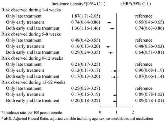 We also classified the TXA treatment into three groups: (1) early TXA treatment in an emergency department; (2) late TXA treatment after hospitalization; and (3) both early and late TXA treatment. Figure 4 presents the risk of mortality in those who received early TXA treatment compared with those who only received late TXA treatment. Regarding risk during the first and fourth weeks, the aHR for early treatment was 0.55 (95% CI: 0.46–0.65), and the aHR for both early and late treatment was 0.74 (95% CI: 0.63–0.86). Regarding risk during the 13th and 52nd weeks, the aHR for early treatment was 0.89 (95% CI: 0.78–1.02), and the aHR for both early and late treatment was 0.89 (95% CI: 0.78–1.01).