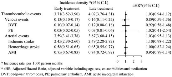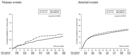 The thromboembolic events (including deep-vein thrombosis, pulmonary embolism, acute myocardial infarction, hemorrhagic stroke, and ischemic stroke) are presented in Figure 5. The forest plot analysis indicated no significant association between thromboembolic events and early or late TXA treatment (aHR: 1.03, 95% CI: 0.94–1.12). The Kaplan–Meier survival analysis also identified no significant increased cumulative probability of either venous or arterial events (log-rank: p = 0.3654 and 0.0975, respectively, Figure 6).