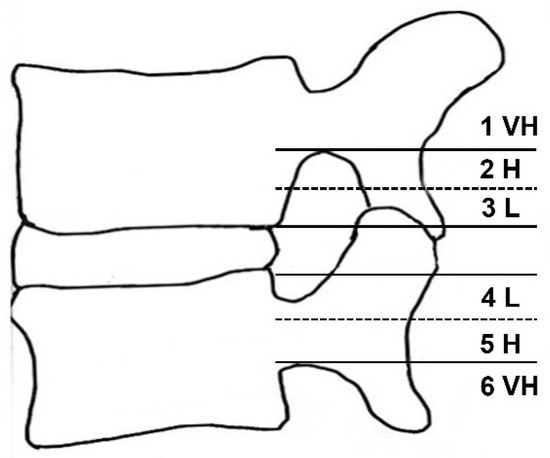 Schematic illustration of the six migrated lumbar disc grades of the new grading system in the sagittal plane. Note the degree of disc migrations; very high (VH), high (H), and low (L).