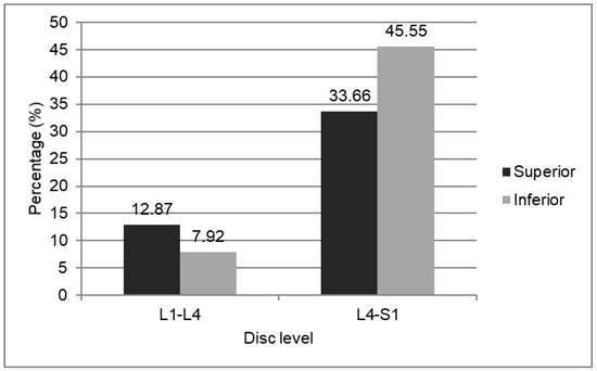The direction of disc migration was found to differ according to the disc level or the patient’s age. Although it did not reach statistical significance, the superior disc migration tended to be higher in the upper lumbar level (61.9% in the L1–2, L2–3, or L3–4 levels), while the inferior disc migration tended to be higher in the lower lumbar level (57.5% in the L4–5 or L5–S1 level; p = 0.1426, Figure 3).