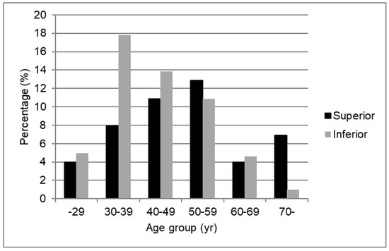 There was a tendency for more superior disc migration in older patients aged ≥ 50 years (58.5%), whereas there was a tendency for more inferior disc migration in younger patients aged < 50 years (61.7%; p = 0.0671, Figure 4).