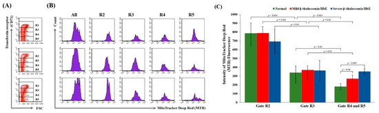 In this study, in vitro CD34+ progenitor cells culture was performed, then cells were harvested on day 16 of culture. At this stage, greater than 95% of cells showed positive CD235a staining (data not shown). For mitochondria determination study, cells were co-stained for CD71 and MTR mitochondria-specific dyes. Four subpopulations of erythroid cells were defined according to levels of CD71 expression that are known to decrease in level during erythroid maturation, as shown in the R2 to R5 gates (Figure 1A; R1 gate represents all cells). The R2 gate contained the cells in the early stage of differentiation with a larger size, whereas the cells in the R5 gate were of the late stage of erythroid maturation (Figure 1A compares cell size in the forward scatter (FSC) axis). The R4 and R5 populations became more abundant in cells derived from normal control, while these subpopulations were rare in cells derived from β0-thalassemia/HbE patients, indicating that terminal erythroid maturation was impaired in β-thalassemia/HbE cells. It is known that mitophagy aids erythroid maturation, and therefore, the intensity of MTR fluorescence reflecting the number of mitochondria was further analyzed in each cell subpopulation (Figure 1B). Staining with MTR alone provided optimal separation between stained and unstained cells (data not shown). The reduction of MTR fluorescent intensity in early to later erythroid subpopulations represents the loss of mitochondria during cell maturation. There was no difference in the intensity of MTR fluorescence in R4 and R5 subpopulations. Thus, these 2 gates were combined for further analysis. As expected, a gradual decline in MTR fluorescent intensity was revealed during differentiation of normal erythroblast cells (Figure 1C; R2 compared to R3 gates, p = 0.005; R3 compared to R4/5 gates, p = 0.03). The significant reduction of MTR fluorescent intensity in R2 to R3 subpopulation was also found in β0-thalassemia/HbE cells. However, the reduction of MTR fluorescent intensity in R3 to R4/5 subpopulations that represent the loss of mitochondria in terminal erythroid maturation was not observed in cells derived from severe β0-thalassemia/HbE patients. These findings reveal the defective mitochondria removal in the late-stage differentiation of β0-thalassemia/HbE erythroid cells.