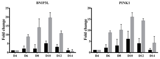 Quantitative RT-PCR analysis of BNIP3L and PINK1 transcripts. The mRNA levels were measured at days 4, 6, 8, 10, 12 and 14 of in vitro erythroid culture. Results from quantitative RT-PCR have been depicted as relative fold change of each day compared to day 4 with the mean and SEM value normalized to ribosomal protein S18 (RPS18) from three independent subjects of β0-thalassemia/HbE (gray bar) and healthy normal control (black bar).
