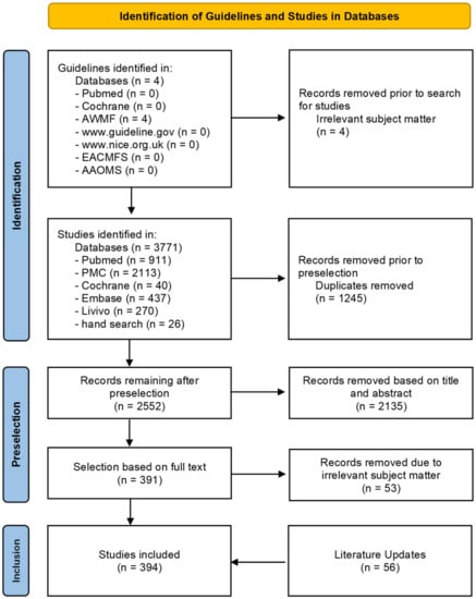 Initially, a search for national and international guidelines was conducted within the databases PubMed and Cochrane, the AWMF database, www.guideline.gov (accessed on 15 February 2022), www.nice.org.uk (accessed on 15 February 2022) and the websites of the European (EACMFS: European Association of Cranio-Maxillo-Facial Surgery, https://www.eacmfs.org/, accessed on 15 February 2022) and American (AAOMS: American Association of Oral and Maxillofacial Surgeons, https://www.aaoms.org/, accessed on 15 February 2022) specialist medical societies for oral and maxillofacial surgery (OMFS). This was followed by a search for individual publications in PubMed, PubMed Central (PMC), Embase, Cochrane Library und Livivo databases (PRISMA item 6). Titles and abstracts of potentially eligible records were reviewed and assessed by two medical experts independently (C.S. and T.E.). Duplicates and studies not fulfilling the inclusion criteria or fulfilling the exclusion criteria were removed. A further selection was made by removing publications with non-suitable target populations based on a full text analysis. Additional sources were included in the guideline after an additional manual search and following a literature update (Figure 1) (PRISMA items 7, 8 and 9).