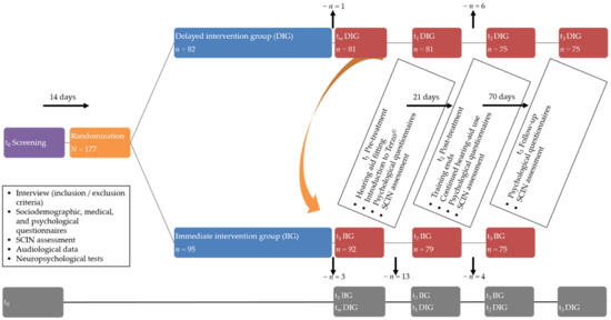 Following recruitment and prior to treatment onset, participants completed an initial data screening, the results of which are reported elsewhere [34]. By applying a randomized-controlled cross-over design, participants were then randomized to an immediate or delayed intervention group. Tinnitus-related distress, perceived stress, and psychological epiphenomena were obtained at four times: pre-treatment/wait [IIG: t1; DIG: wait], post-treatment/pre-treatment [IIG: t2; DIG: t1], follow-up/post-treatment [IIG: t3; DIG: t2], and follow-up [DIG: t3] (Figure 1). Between and within-group analyses investigated treatment-related psychological effects and their stability over a 70-day follow-up period after the end of the intervention phase (Figure 2).