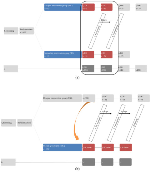 For the randomization protocol, two types of identical envelopes were created. The envelopes contained a card with a printed “A” (IIG; 75) or “B” (DIG; 75) stamp, respectively. Following a simple randomization protocol, an enrolling clinician (NA) presented participants with a box from which an envelope was drawn. The enrolling clinician was blind to the drawn intervention. Following this allocation procedure, participants met with a Terzo employee, handed over the envelope, and the respective trial protocol and procedures were explained. Randomization was continued until the target n of 75 patients was reached in both treatment arms. The present study reports all available data from all participants that were included in the initial randomization process (n = 177).
