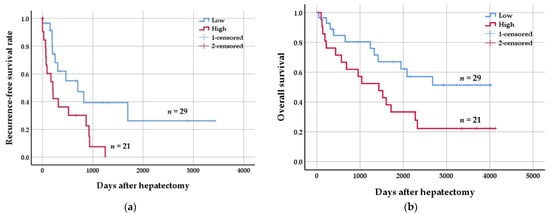 When HCC patients were divided into low (n = 29) and high (n = 21) parafibromin expression groups, high parafibromin expression correlated with poorer prognosis. Kaplan–Meier survival curve analysis showed that tumors with high parafibromin expression were associated with poorer recurrence-free survival (RFS) (p = 0.014, log-rank test = 6.079) and overall survival (OS) (p = 0.036, log-rank test = 4.414) (Figure 2).