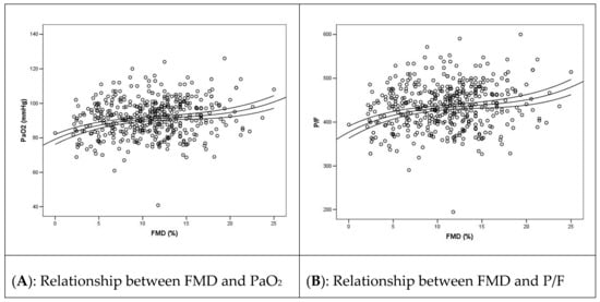 We observed a significant association of arterial partial pressure of oxygen (PaO2), ratio of PaO2 to fractional inspired oxygen (P/F), forced expiratory volume in one second (FEV1), and six minutes walking test (6MWT) with FMD, as shown in Figure 3. Of note, FMD had a cubic relationship with PaO2 (Figure 3A; r2 = 0.030; p = 0.004), P/F (Figure 3B; r2 = 0.030; p = 0.004), FEV1 (Figure 3C; r2 = 0.026; p = 0.008), and 6MWT (Figure 3D; r2 = 0.066; p = 0.0001). The low r2 values with a high significance of the association are suggestive of the fact that other factors than FMD can affect the variability of these values (as, for example, a previous COPD in the case of FEV1) but that this association is significant, meaning that FMD has a clear association with these variables.