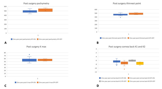 - Cifariello, F.; Minicucci, M.; Di Renzo, F.; Di Taranto, D.; Coclite, G.; Zaccaria, S.; De Turris, S.; Costagliola, C. Epi-Off versus Epi-On Corneal Collagen Cross-Linking in Keratoconus Patients: A Comparative Study through 2-Year Follow-Up. J. Ophthalmol. 2018, 2018, 4947983. [Google Scholar] [CrossRef] [PubMed]