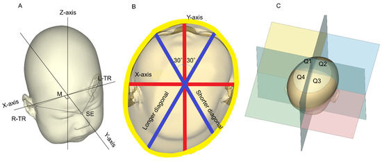 Three-dimensional images. This figure is a modified version of the figure obtained from [6]. (A) Methods used to determine the reference plane (level 0), X-axis, Y-axis, and Z-axis. (B) Cross-sectional view of level 3. Methods used to determine cranial asymmetry are shown. (C) Methods used to determine the anterior symmetry ratio and posterior symmetry ratio. M: midpoint between the tragions; L-TR: left tragion; R-TR: right tragion; SE: sellion; TR: tragion; Q: quadrant.