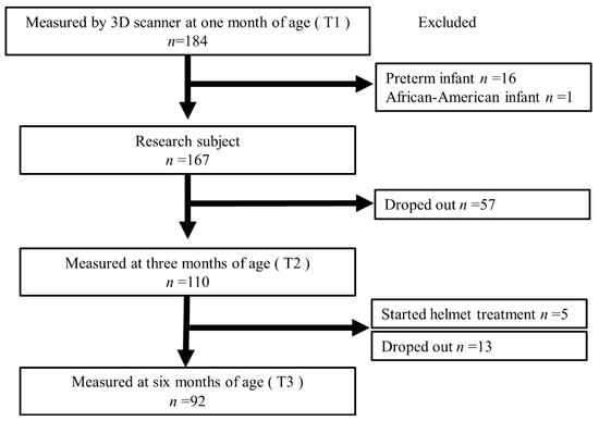 During the study period, 184 infants visited our hospitals and underwent 3D head scanning. Figure 2 shows the flowchart of the enrolled infants. Sixteen patients with a gestational age < 37 weeks were excluded. One African-American infant was excluded from the study. None of the patients had a history of neonatal asphyxia. The 167 infants were included at T1 (mean age, 35.6 ± 6.3 days). Of these, 57 individuals dropped out of the study; therefore, 110 individuals were measured using the 3D scanner at T2 (mean age, 99.3 ± 9.9 days). Of the 110 individuals, 5 were excluded from the study because severe DP was diagnosed and CHT was started. In the next phase, an additional 13 individuals dropped out; therefore, 92 underwent 3D scanning at T3 (mean age, 188.5 ± 11.1 days). Only 3 of the 92 infants started CHT after instrumentation; therefore, they were not excluded from this study. Of the 167 infants initially considered, 8 (4.8%) started CHT.