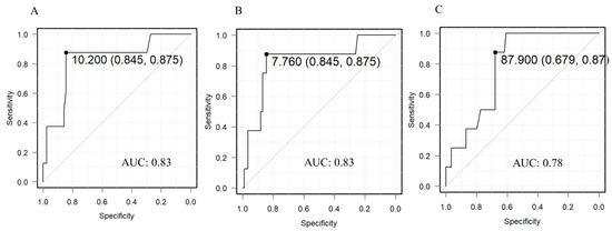 Receiver operating characteristic curves. (A) Cranial asymmetry. (B) Cranial vault asymmetry index. (C) Posterior symmetry ratios. AUC: area under the curve.