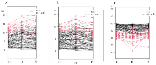 Progress diagram of each parameter with the thresholds used at T1. (A) Cranial asymmetry. (B) Cranial vault asymmetry index. (C) Posterior symmetry ratios. T1: first measurements at 1 month; T2: second measurements at 3 months; T3: third measurements at 6 months.