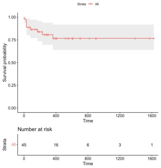 Survival free from sustained focal atrial tachycardia recurrence in the overall study population (n = 45).